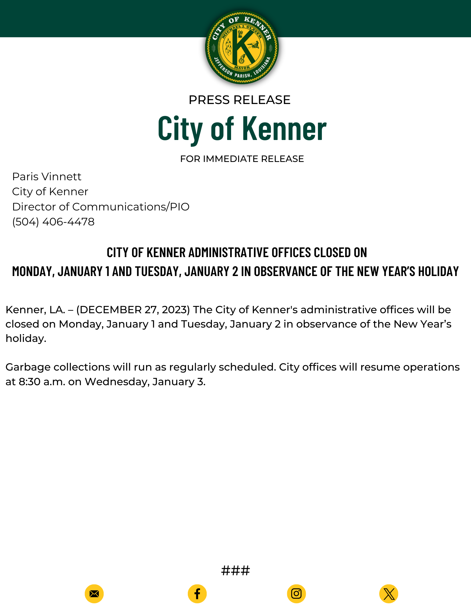 - PRESS RELEASE- Kenner Administrative Offices Closed In Observance of Presidents Day