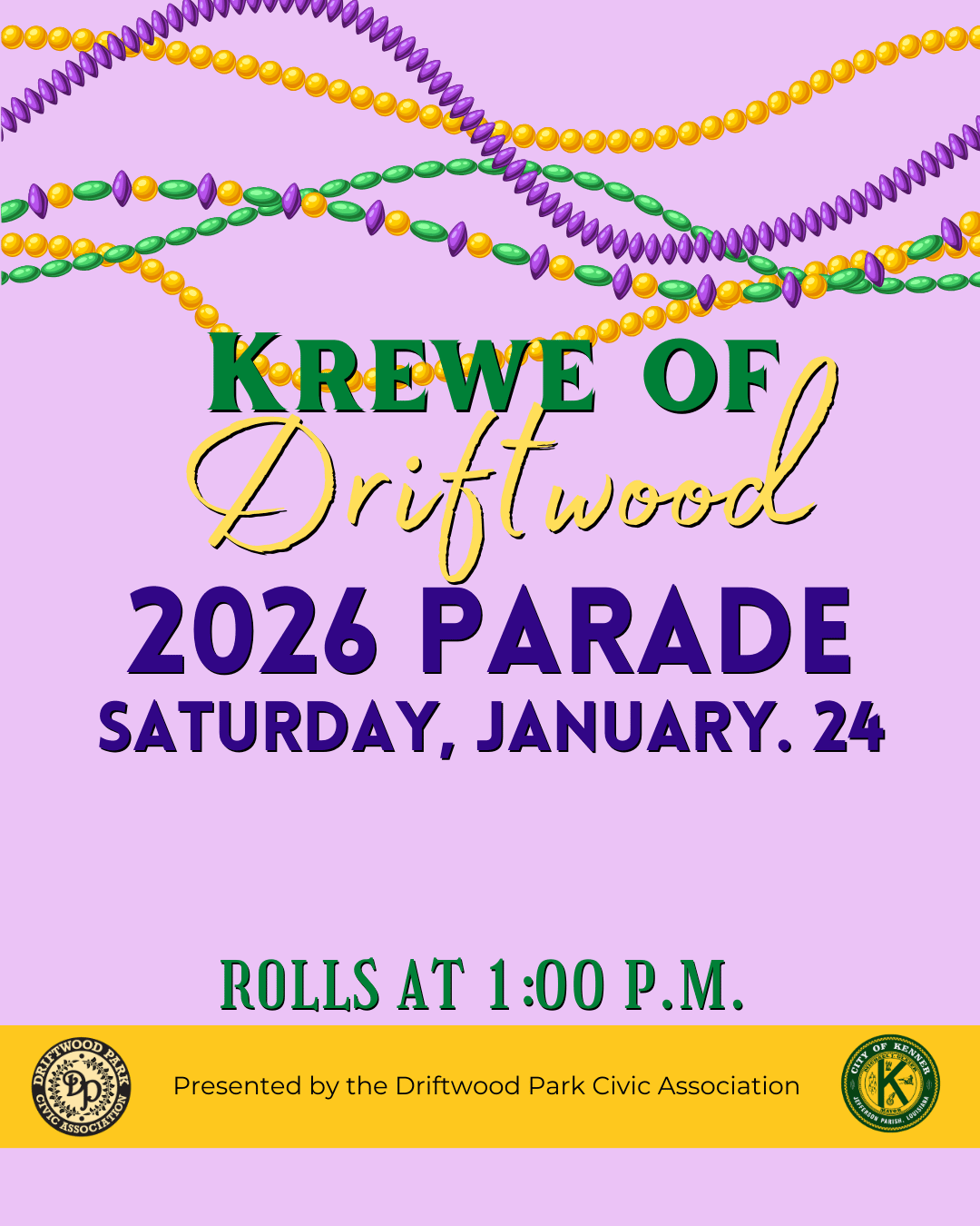 Families join in on the fun, with kids riding along in festively decorated pickup beds, and friendly competition adds to the excitement as judges award prizes for the best themed floats. Part parade, part block party, the Krewe of Driftwood Neighborhood Parade captures the heart of Kenner’s Mardi Gras spirit, celebrating creativity, togetherness, and hometown pride.